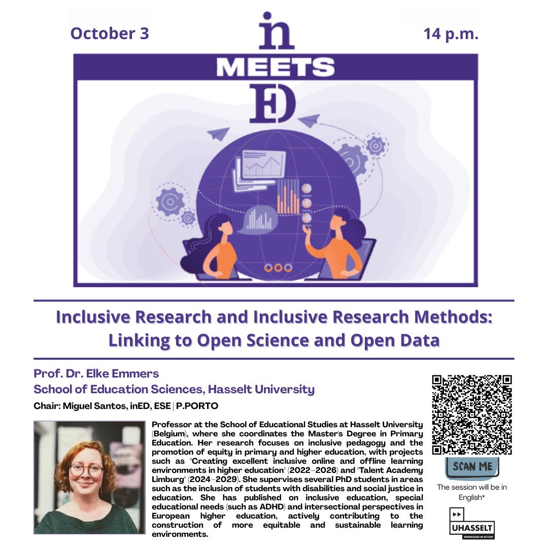 In the next inED Meets session, we welcome Prof. Dr. Elke Emmers (School of Education Sciences, Hasselt University – Belgium) for a thought-provoking talk on: Inclusive Research and Inclusive Research Methods: Linking to Open Science and Open Data