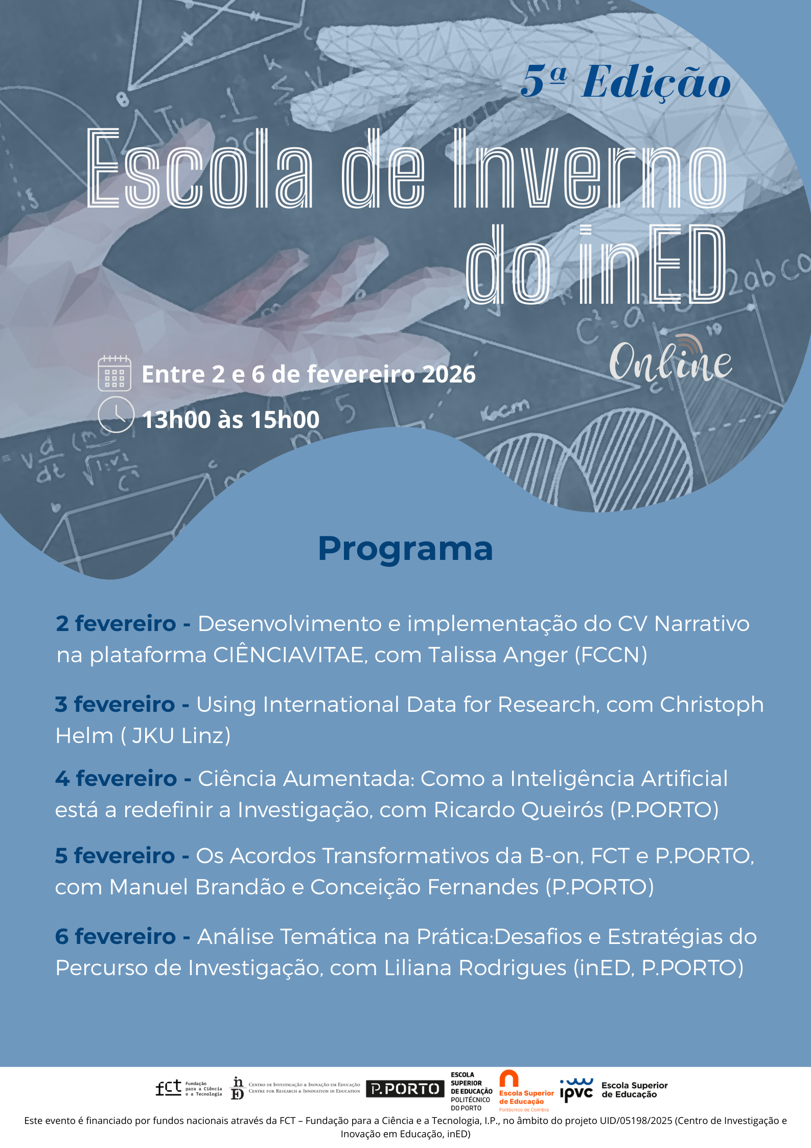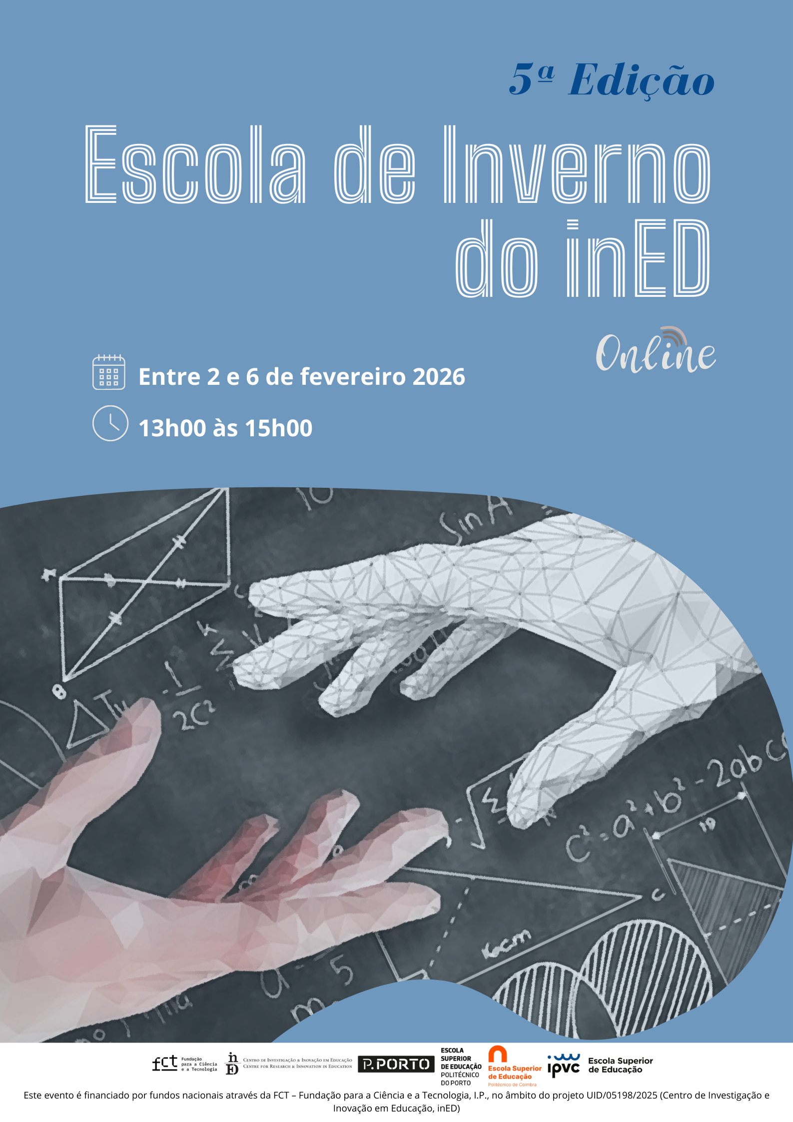 Entre os dias 2 e 6 de fevereiro de 2026, o inED – Centro de Investigação e Inovação em Educação promove a 5.ª edição da Escola de Inverno, em formato online, com sessões diárias das 13h00 às 15h00.