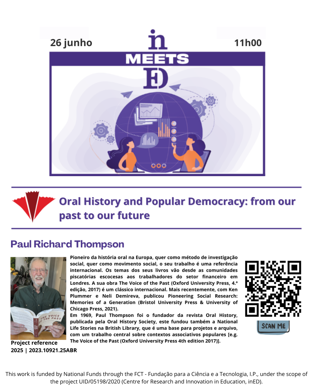 Na próxima sessão inED meets, recebemos Paul Richard Thompson, uma referência incontornável na área da história oral e fundador da Oral History Society.